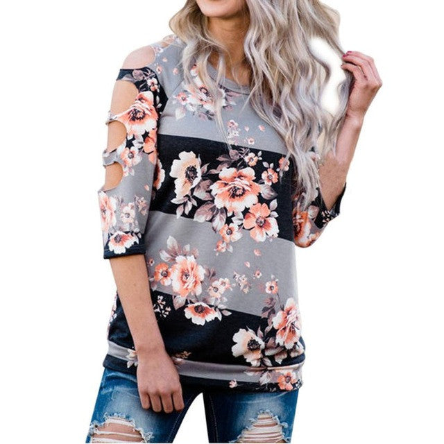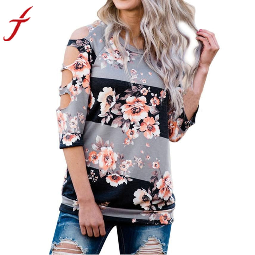 Sexy Hole T-shirt Women Off Shoulder Shirt Casual Loose Tops Ladies Floral Printing Multicolor 2017 Hot Summer Shirt Femme